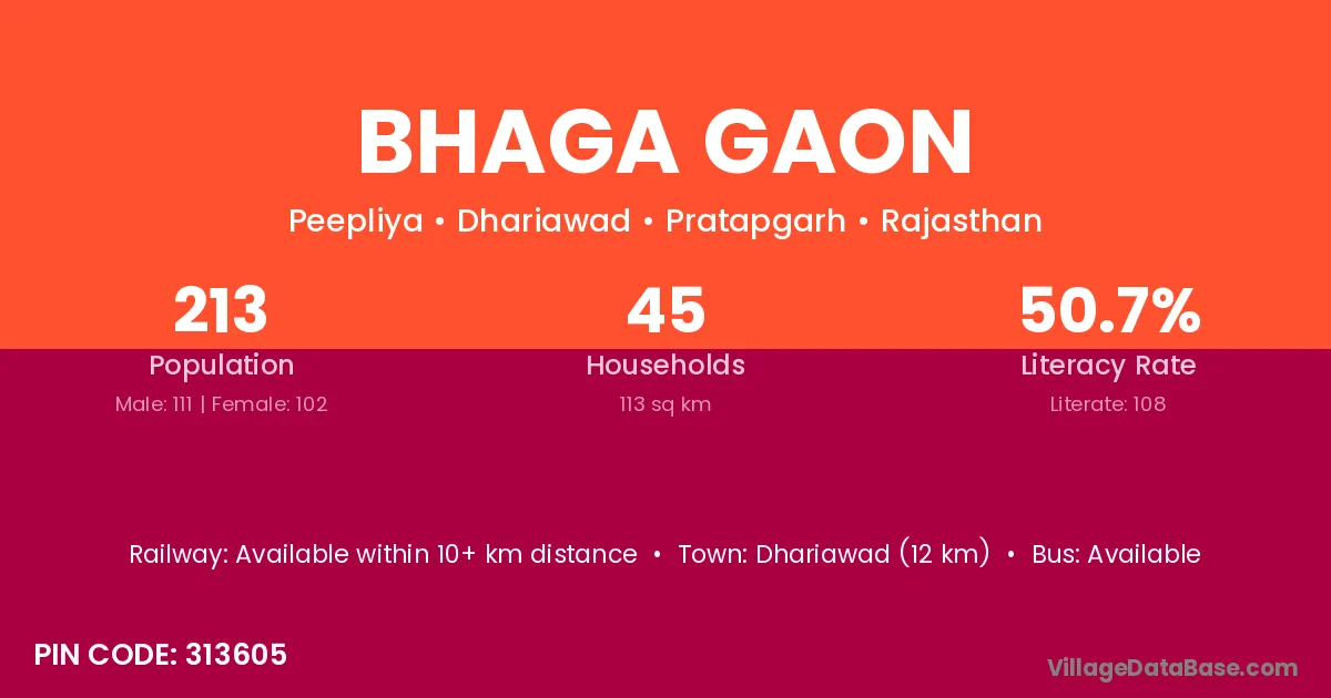 Dhariawad (12 km) is the nearest town to Bhaga Gaon village for major economic activities and is located approximately 12 km away.