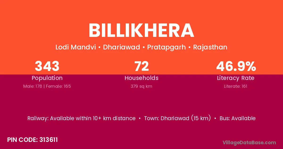 Dhariawad (15 km) is the nearest town to Billikhera village for major economic activities and is located approximately 15 km away.
