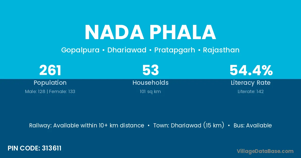 Dhariawad (15 km) is the nearest town to Nada Phala village for major economic activities and is located approximately 15 km away.