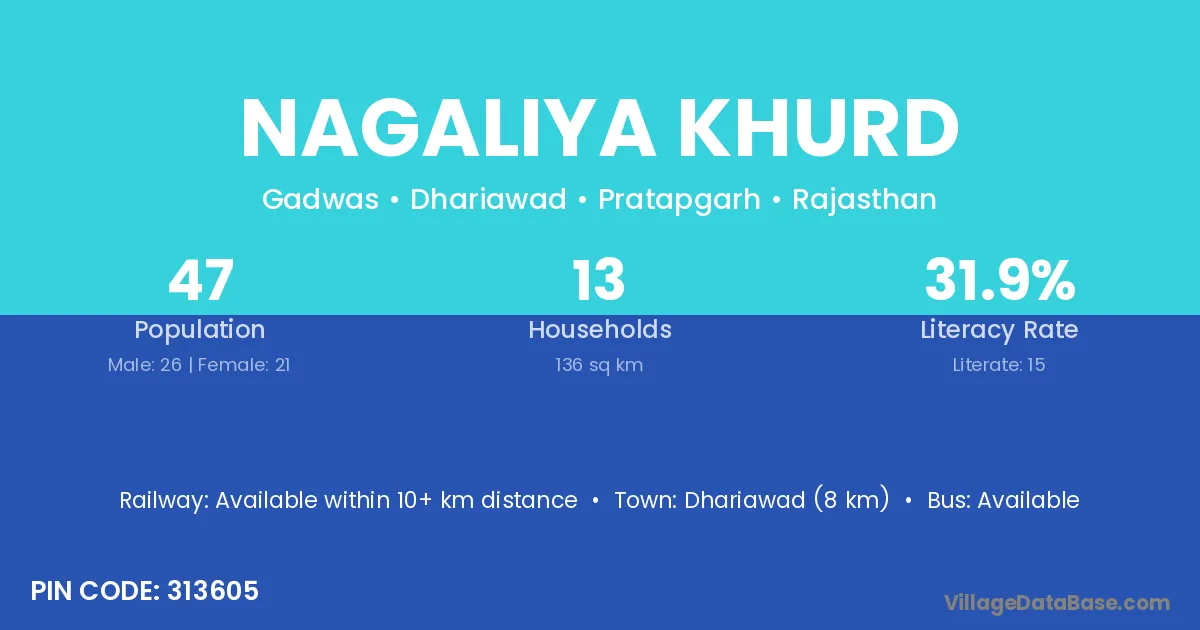Dhariawad (8 km) is the nearest town to Nagaliya Khurd village for major economic activities and is located approximately 8 km away.