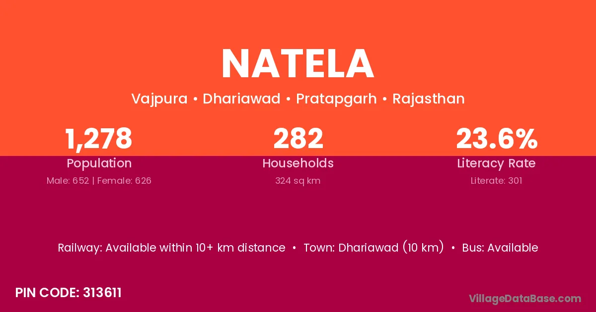 Dhariawad (10 km) is the nearest town to Natela village for major economic activities and is located approximately 10 km away.