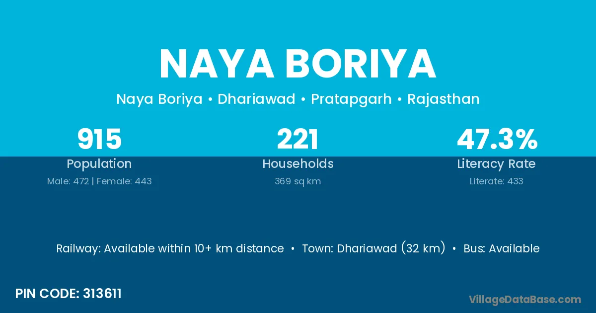 Dhariawad (32 km) is the nearest town to Naya Boriya village for major economic activities and is located approximately 32 km away.