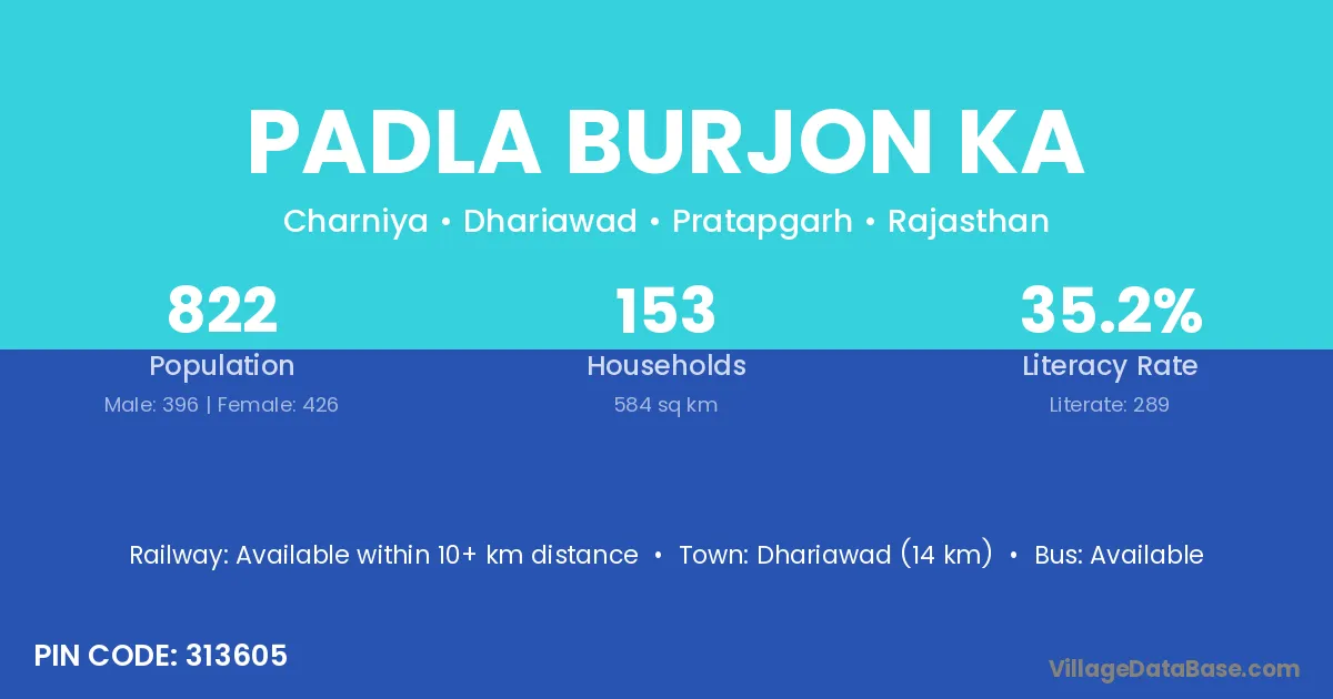 Dhariawad (14 km) is the nearest town to Padla Burjon Ka village for major economic activities and is located approximately 14 km away.