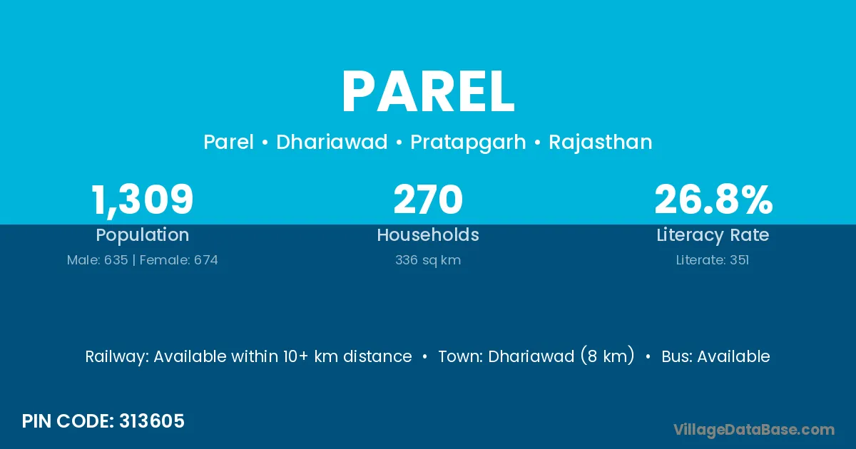 Dhariawad (8 km) is the nearest town to Parel village for major economic activities and is located approximately 8 km away.