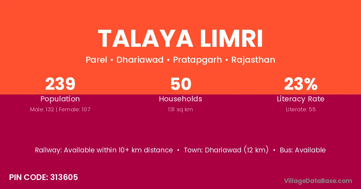 Dhariawad (12 km) is the nearest town to Talaya Limri village for major economic activities and is located approximately 12 km away.