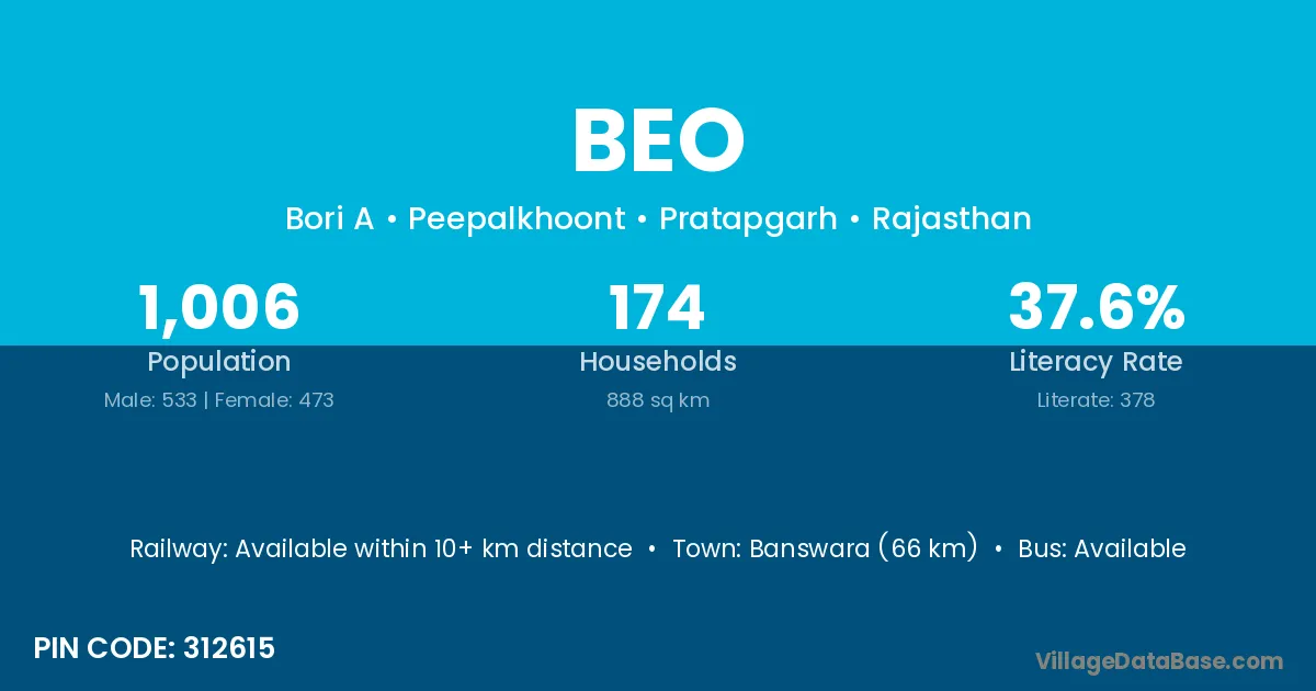 Banswara (66 km) is the nearest town to Beo village for major economic activities and is located approximately 66 km away.