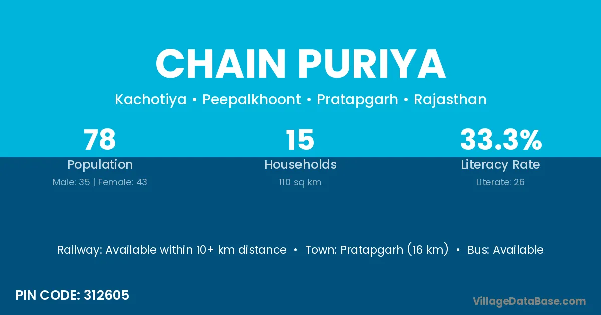 Pratapgarh (16 km) is the nearest town to Chain Puriya village for major economic activities and is located approximately 16 km away.