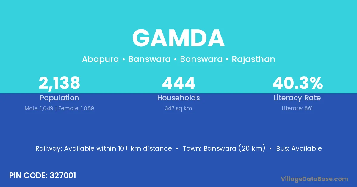 Pratapgarh (55 km) is the nearest town to Gamda village for major economic activities and is located approximately 55 km away.