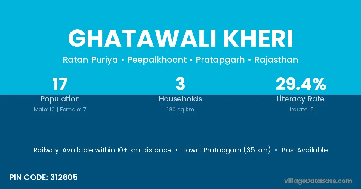 Pratapgarh (35 km) is the nearest town to Ghatawali Kheri village for major economic activities and is located approximately 35 km away.