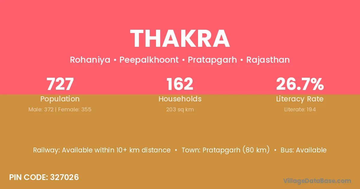 Pratapgarh (80 km) is the nearest town to Thakra village for major economic activities and is located approximately 80 km away.