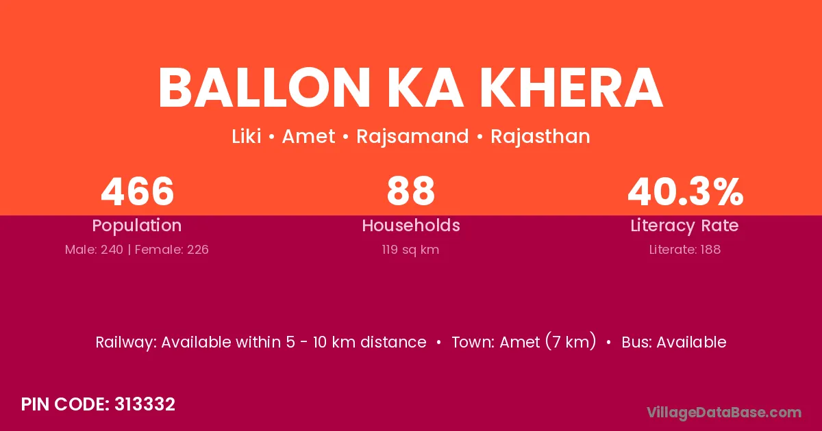 Amet (7 km) is the nearest town to Ballon Ka Khera village for major economic activities and is located approximately 7 km away.