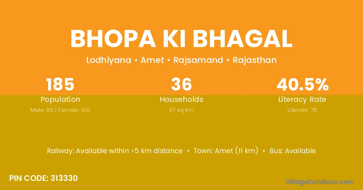 Amet (11 km) is the nearest town to Bhopa Ki Bhagal village for major economic activities and is located approximately 11 km away.