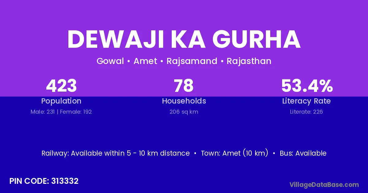 Dewaji Ka Gurha village has a total population of 423 people, of which 231 are males and 192 are females.