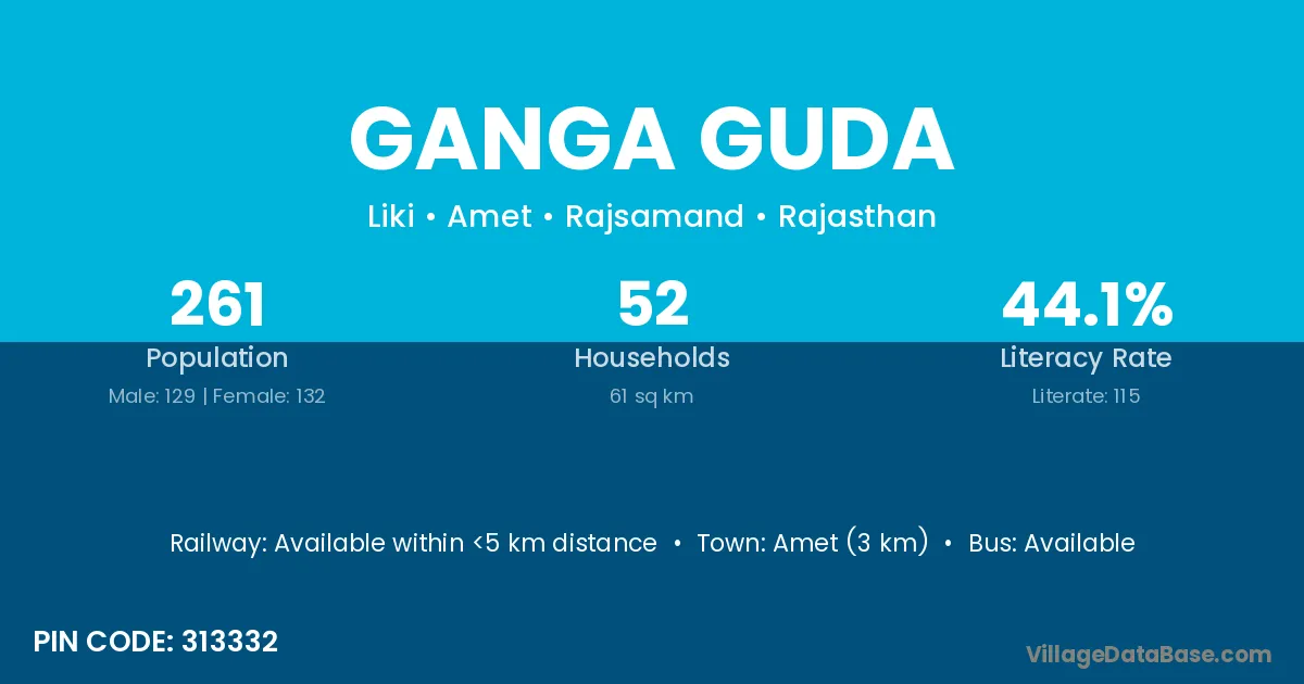 Amet (3 km) is the nearest town to Ganga Guda village for major economic activities and is located approximately 3 km away.