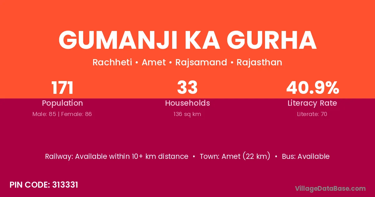 Amet (22 km) is the nearest town to Gumanji Ka Gurha village for major economic activities and is located approximately 22 km away.