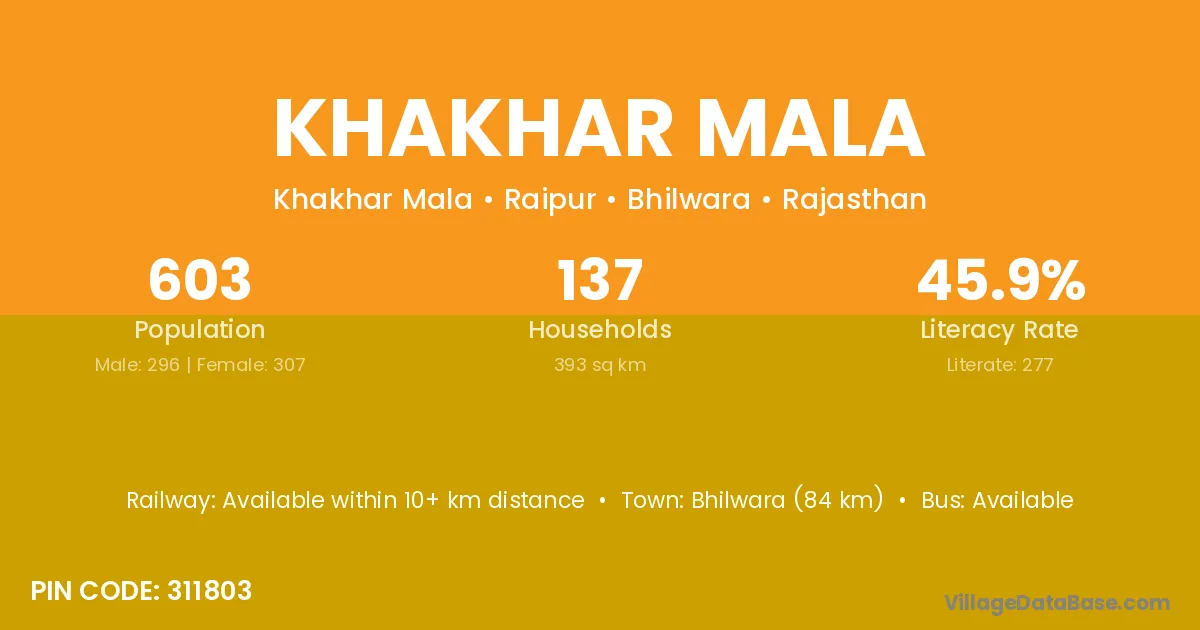 Amet (14 km) is the nearest town to Khakhar Mala village for major economic activities and is located approximately 14 km away.