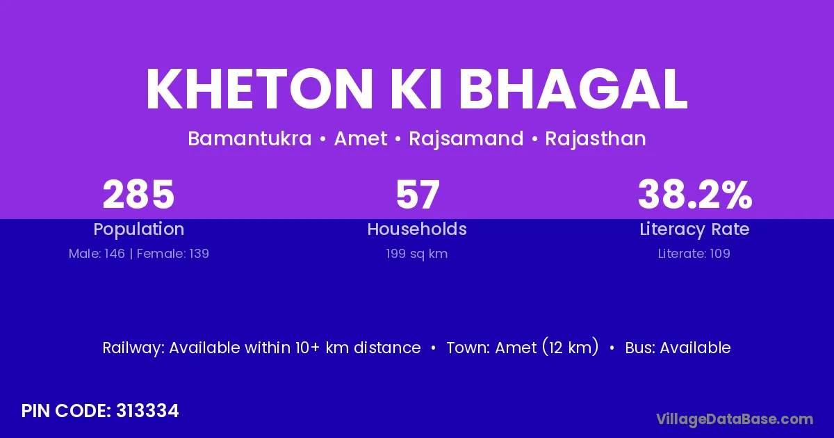 Kheton Ki Bhagal village has a total population of 285 people, of which 146 are males and 139 are females.