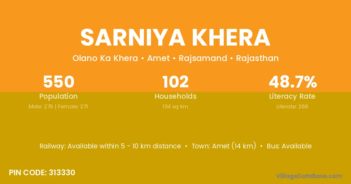 Amet (14 km) is the nearest town to Sarniya Khera village for major economic activities and is located approximately 14 km away.