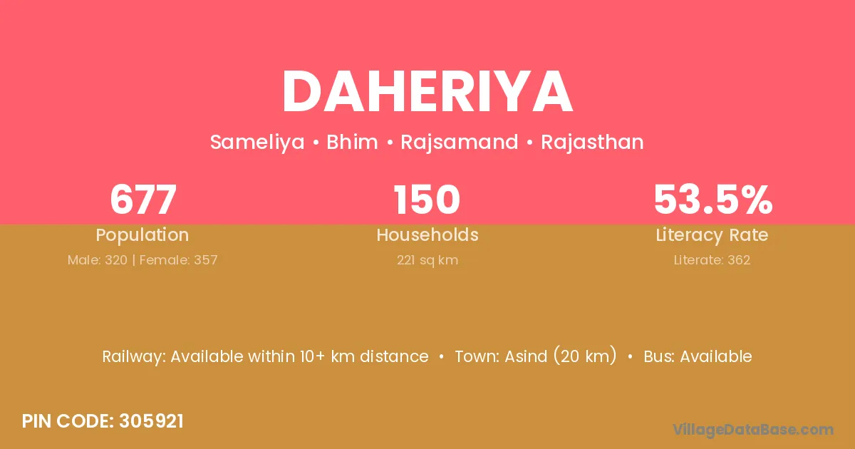 Asind (20 km) is the nearest town to Daheriya village for major economic activities and is located approximately 20 km away.