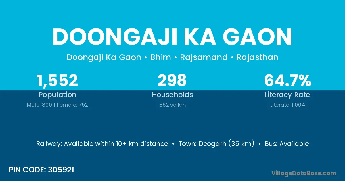 Deogarh (35 km) is the nearest town to Doongaji Ka Gaon village for major economic activities and is located approximately 35 km away.