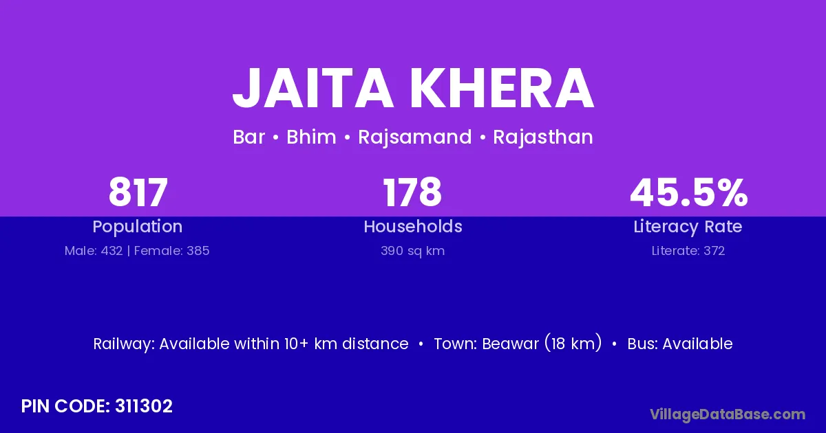 Beawar (18 km) is the nearest town to Jaita Khera village for major economic activities and is located approximately 18 km away.