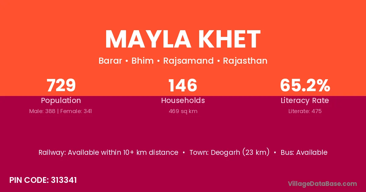 Deogarh (23 km) is the nearest town to Mayla Khet village for major economic activities and is located approximately 23 km away.