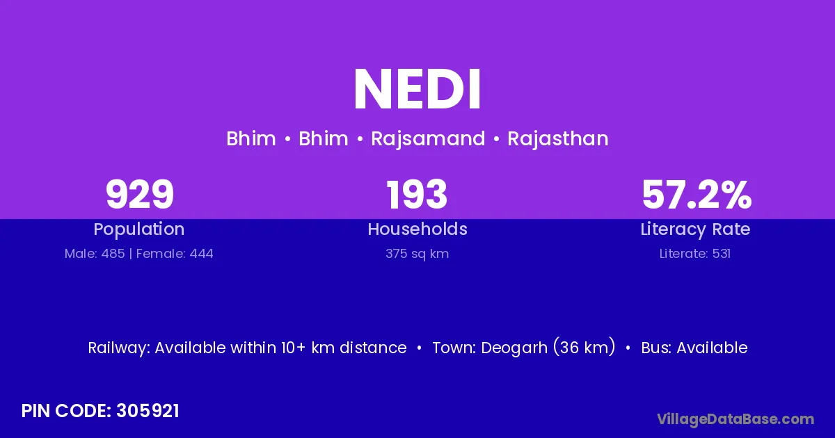 Deogarh (36 km) is the nearest town to Nedi village for major economic activities and is located approximately 36 km away.