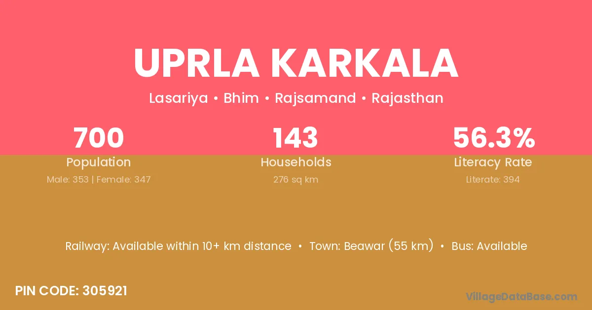 Beawar (55 km) is the nearest town to Uprla Karkala village for major economic activities and is located approximately 55 km away.