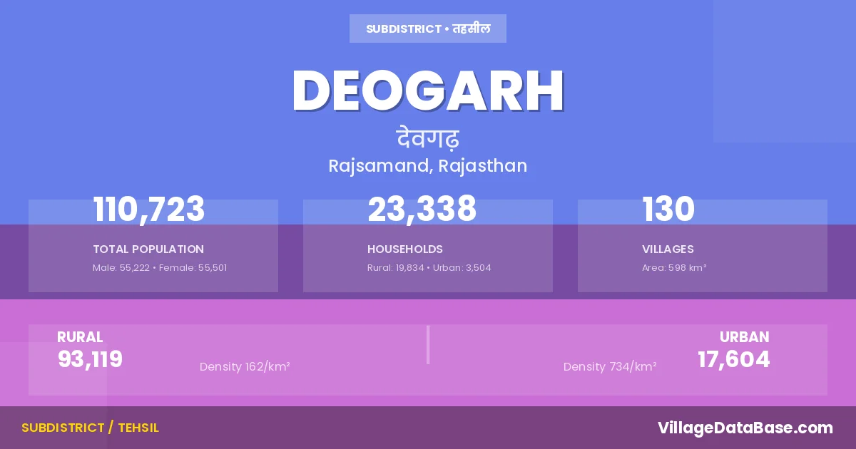 According to the 2011 census The total area of Deogarh Tehsil is 598 km², with a population of 110723 people. The population density is 185 inhabitants per square kilometre, and there are approximately 23338 houses in the sub district.