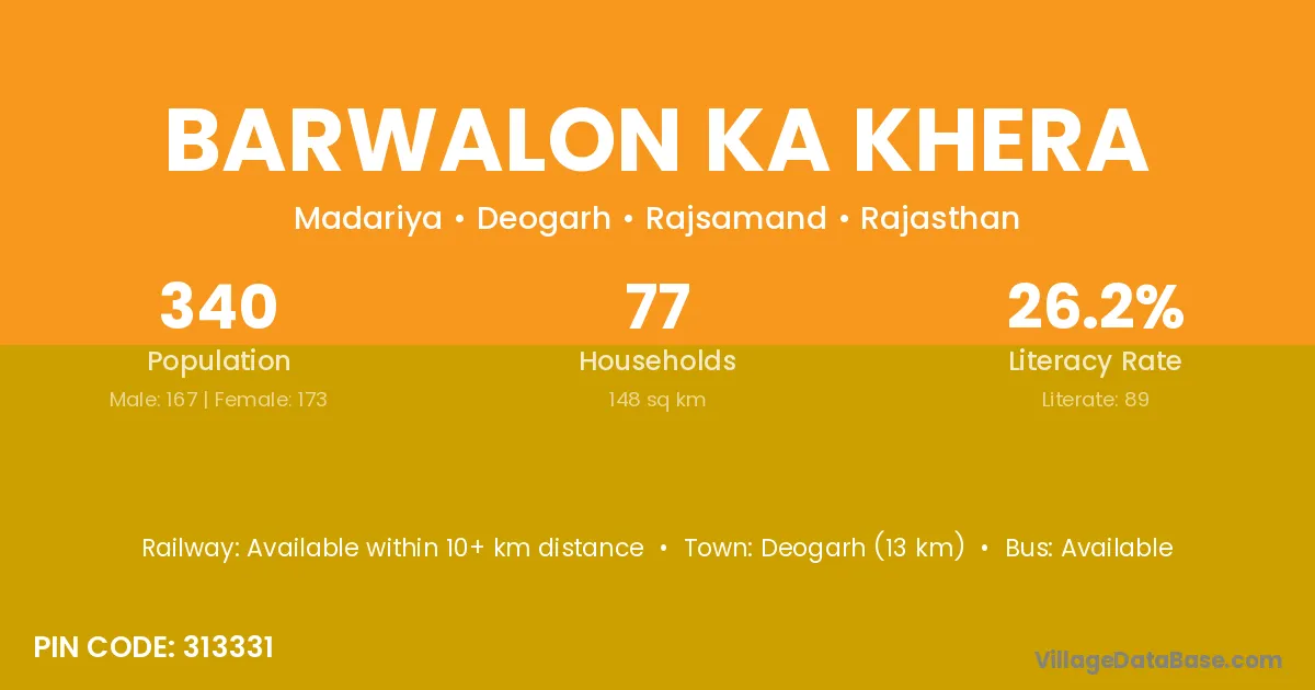 Deogarh (13 km) is the nearest town to Barwalon Ka Khera village for major economic activities and is located approximately 13 km away.