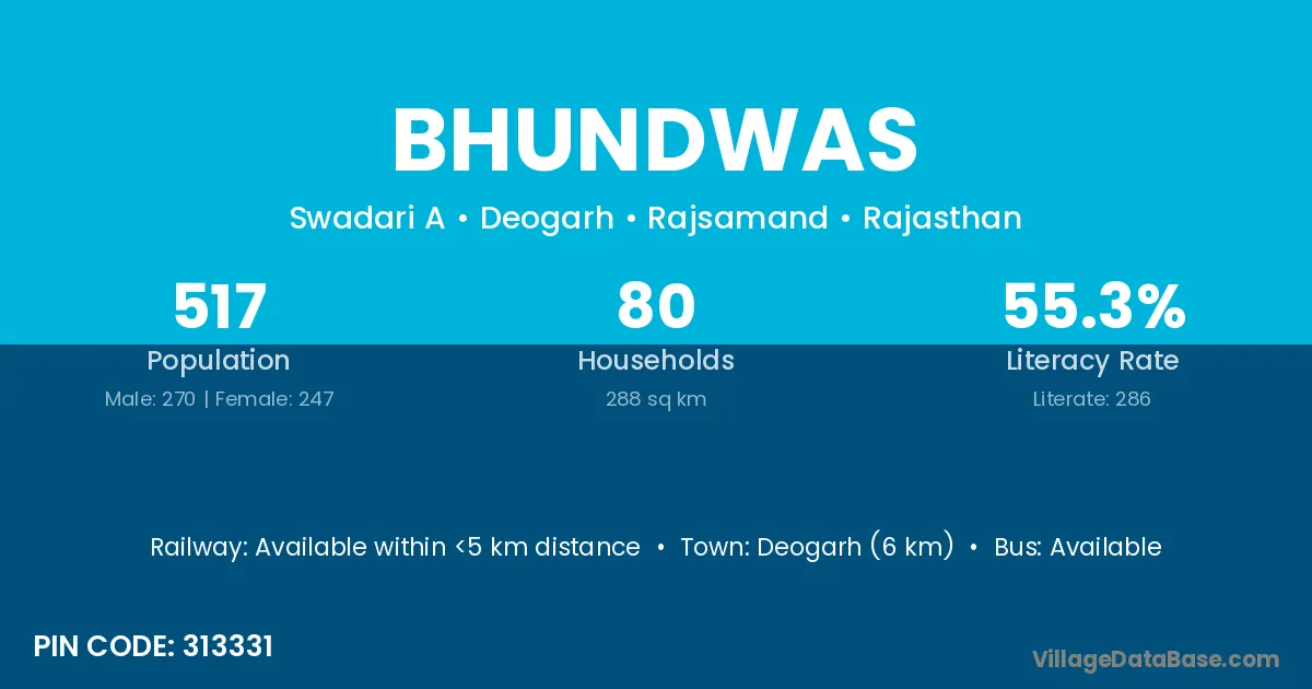 Deogarh (6 km) is the nearest town to Bhundwas village for major economic activities and is located approximately 6 km away.