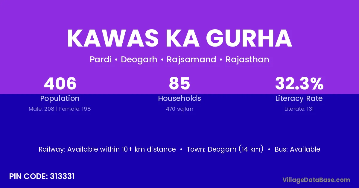Deogarh (14 km) is the nearest town to Kawas Ka Gurha village for major economic activities and is located approximately 14 km away.