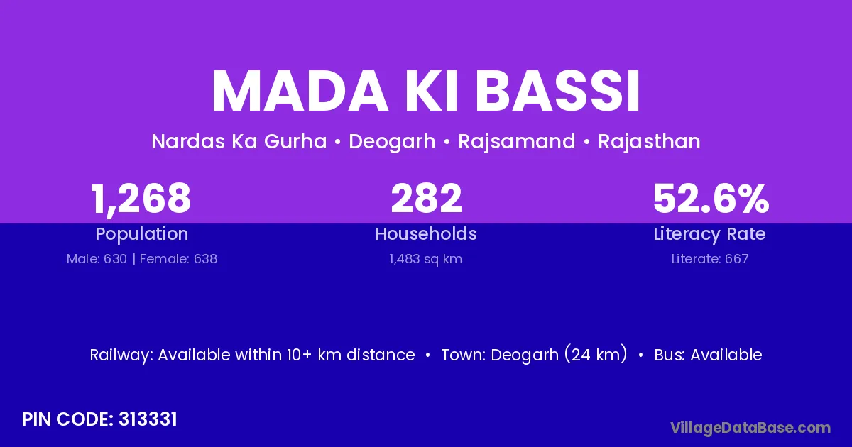 Deogarh (24 km) is the nearest town to Mada Ki Bassi village for major economic activities and is located approximately 24 km away.
