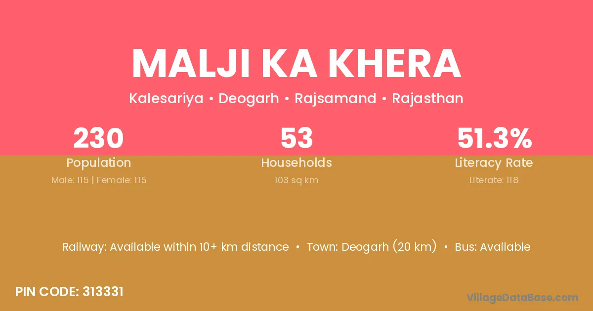 Deogarh (20 km) is the nearest town to Malji Ka Khera village for major economic activities and is located approximately 20 km away.
