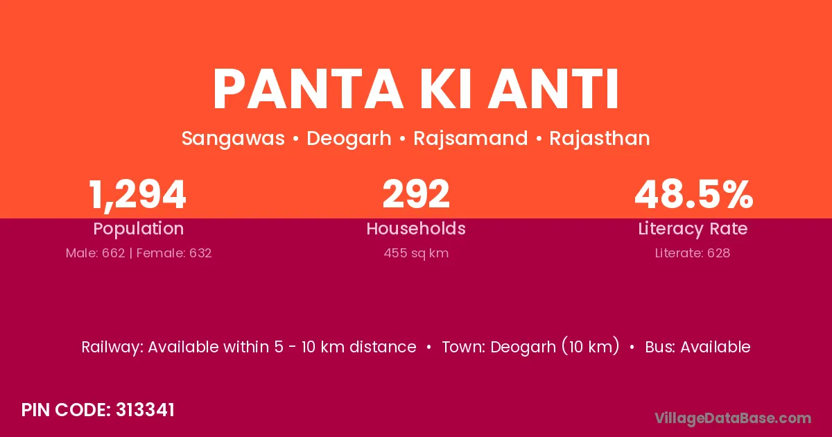 Deogarh (10 km) is the nearest town to Panta Ki Anti village for major economic activities and is located approximately 10 km away.