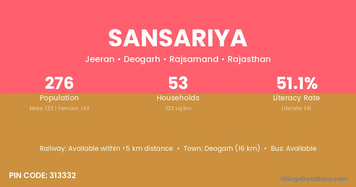 Deogarh (16 km) is the nearest town to Sansariya village for major economic activities and is located approximately 16 km away.