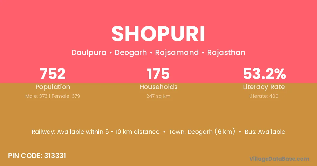 Deogarh (6 km) is the nearest town to Shopuri village for major economic activities and is located approximately 6 km away.