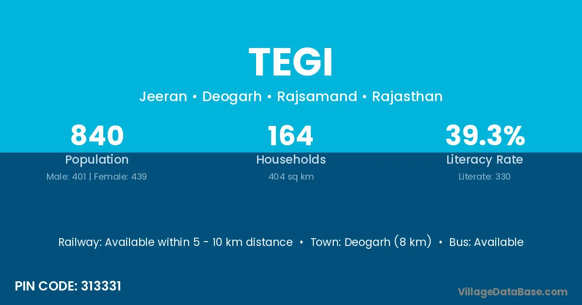 Deogarh (8 km) is the nearest town to Tegi village for major economic activities and is located approximately 8 km away.