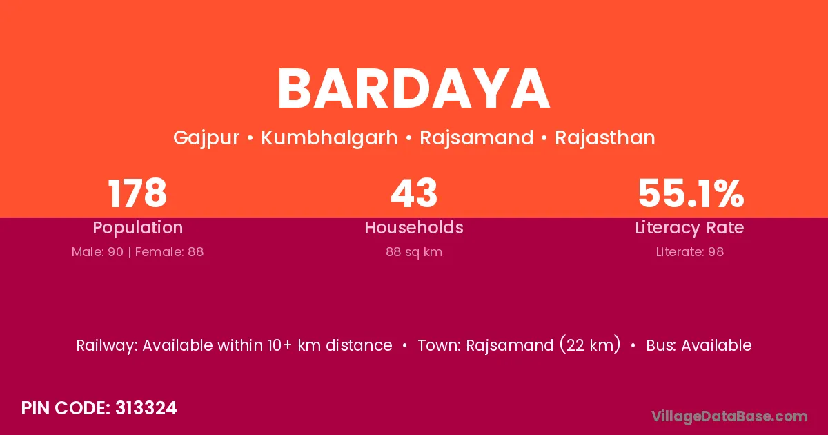 Rajsamand (22 km) is the nearest town to Bardaya village for major economic activities and is located approximately 22 km away.