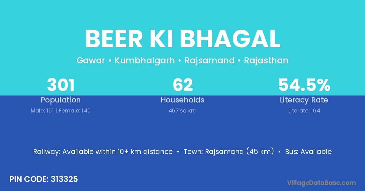 Rajsamand (45 km) is the nearest town to Beer Ki Bhagal village for major economic activities and is located approximately 45 km away.