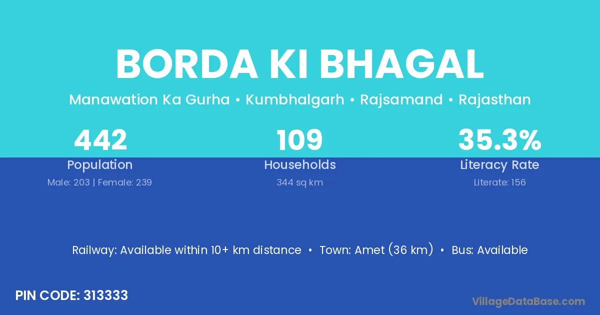 Borda Ki Bhagal village has a total population of 442 people, of which 203 are males and 239 are females.