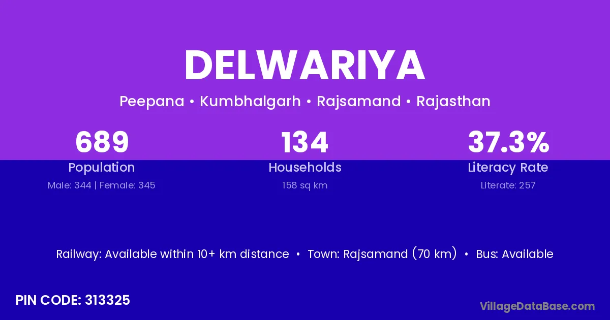Rajsamand (70 km) is the nearest town to Delwariya village for major economic activities and is located approximately 70 km away.
