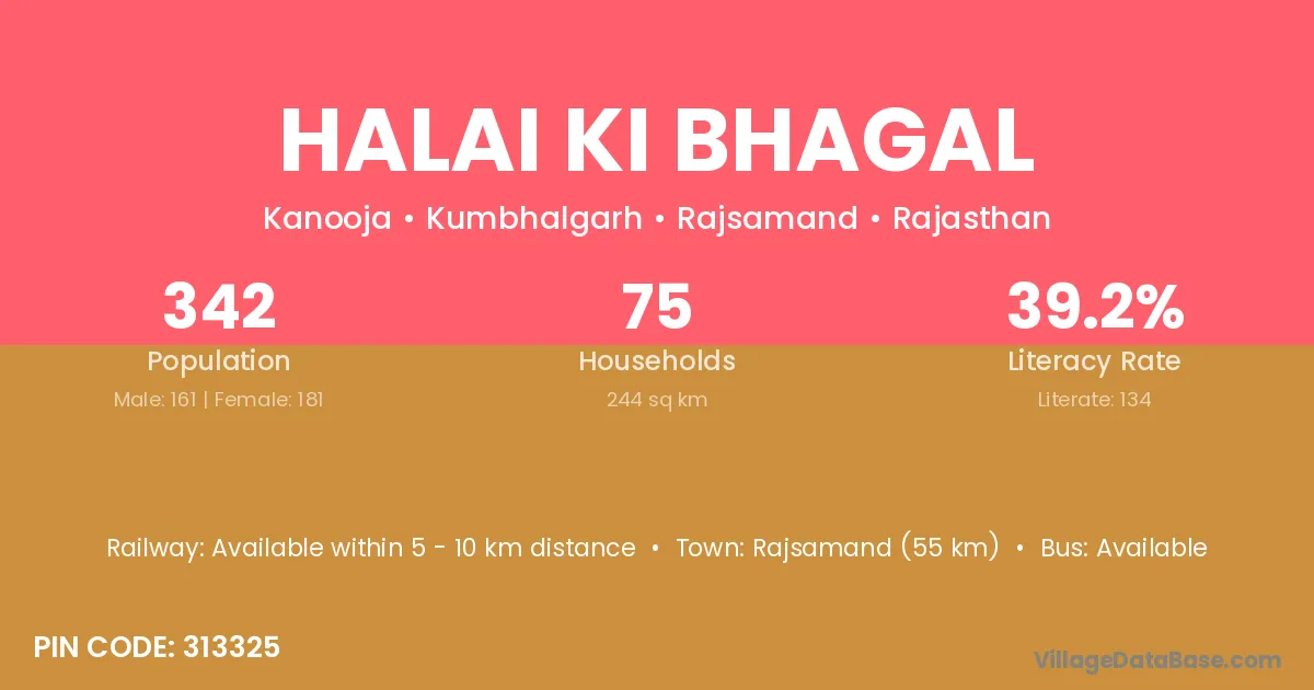 Halai Ki Bhagal village has a total population of 342 people, of which 161 are males and 181 are females.