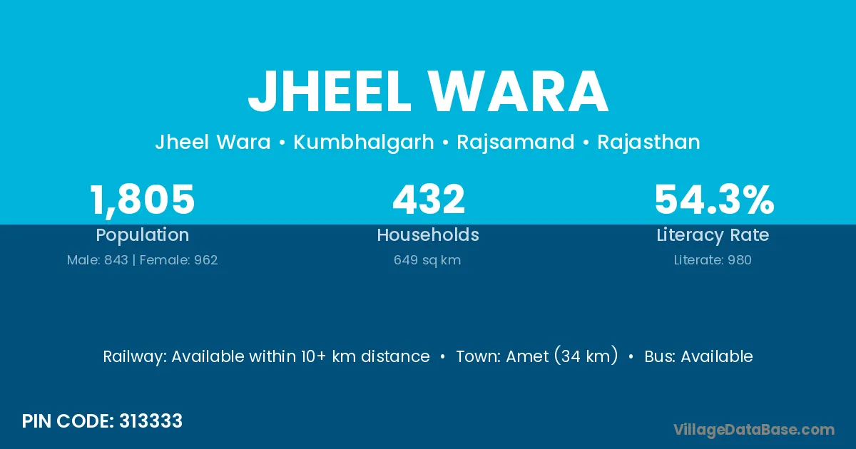 Amet (34 km) is the nearest town to Jheel Wara village for major economic activities and is located approximately 34 km away.