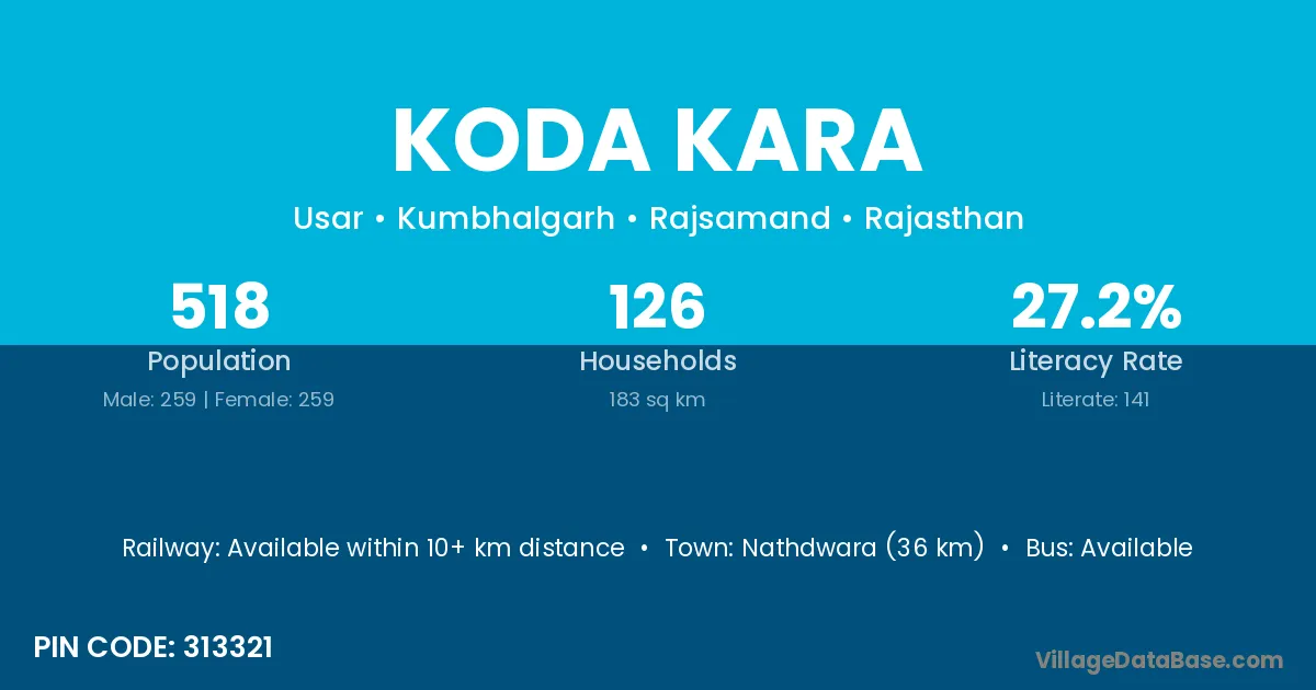 Nathdwara (36 km) is the nearest town to Koda Kara village for major economic activities and is located approximately 36 km away.