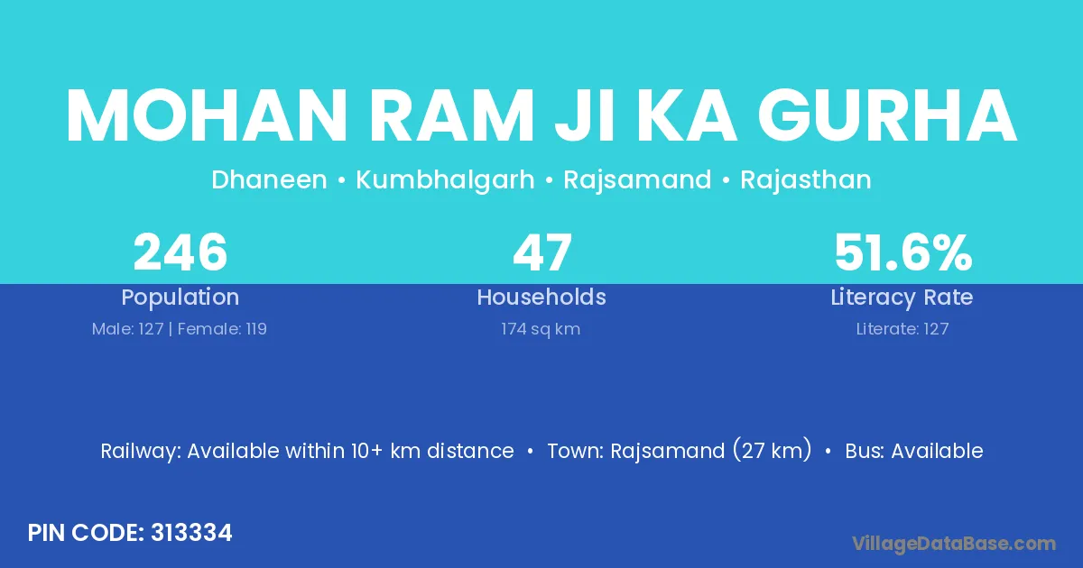 Mohan Ram Ji Ka Gurha village has a total population of 246 people, of which 127 are males and 119 are females.