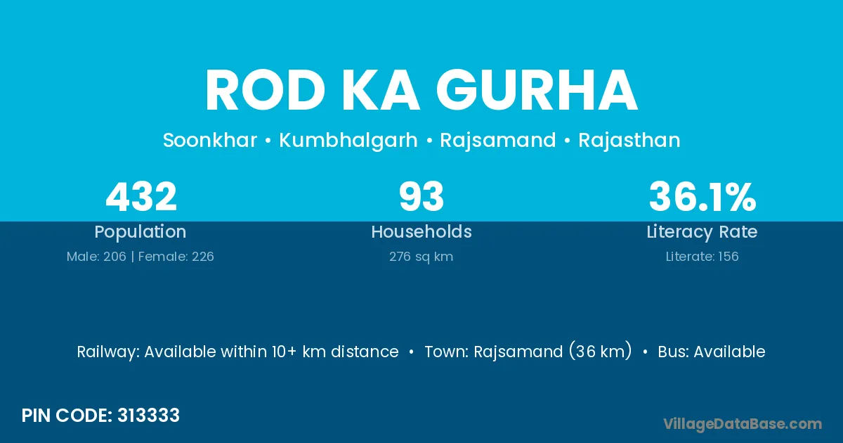 Rod Ka Gurha village has a total population of 432 people, of which 206 are males and 226 are females.