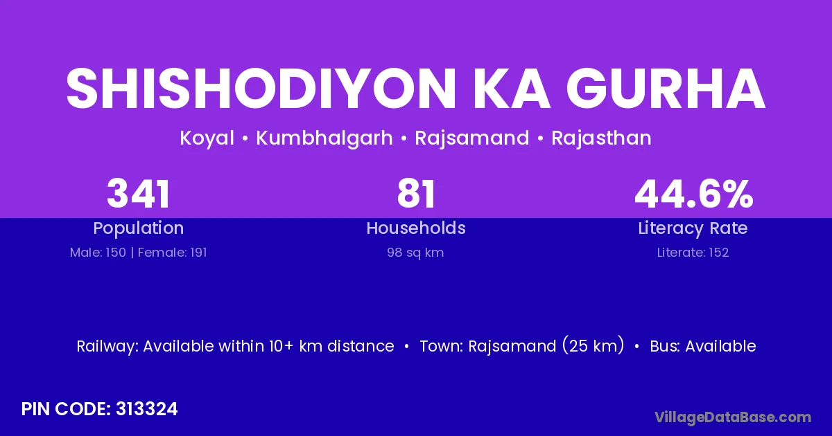 Shishodiyon Ka Gurha village has a total population of 341 people, of which 150 are males and 191 are females.