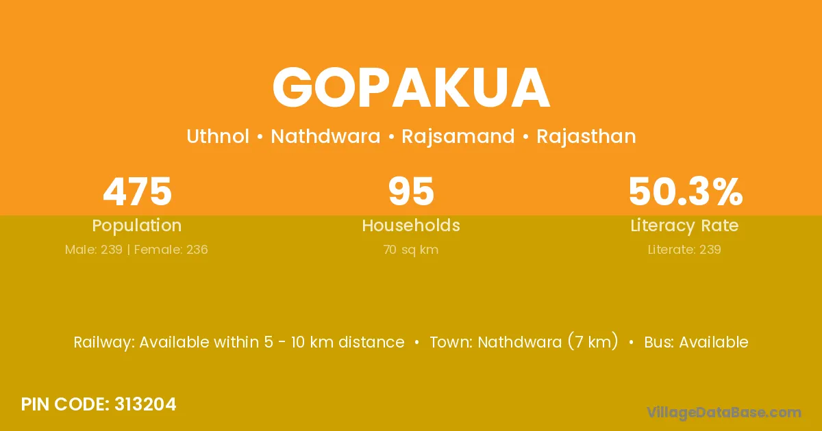 Nathdwara (7 km) is the nearest town to Gopakua village for major economic activities and is located approximately 7 km away.