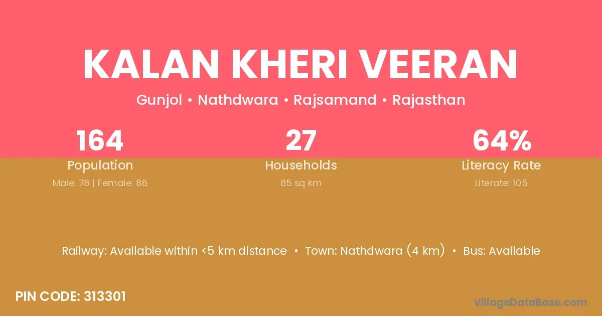 Nathdwara (4 km) is the nearest town to Kalan Kheri Veeran village for major economic activities and is located approximately 4 km away.